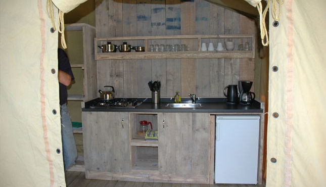 De robuuste steigerhouten keuken heeft koud stromend water, een waterkoker en koffiezetapparaat, evenals een koelkast met vriesvakje. De keuken is volledig uitgerust met alle benodigdheden wat betreft de keukeninventaris, en er is voldoende opbergruimte voor de boodschappen.